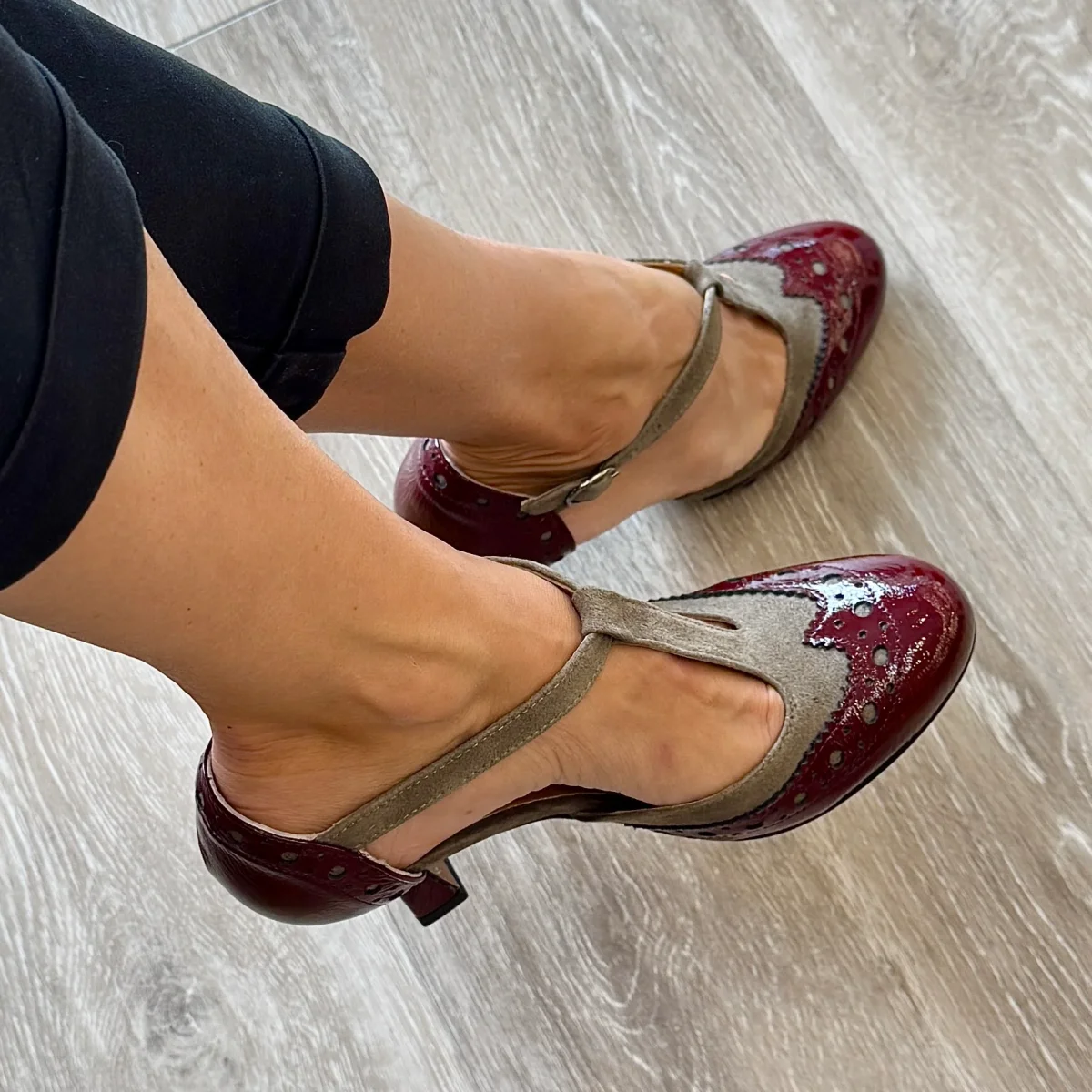 Charleston donna tacco 7 cm vernice bordeaux e camoscio taupe AI25 | pepperinacalzature.com