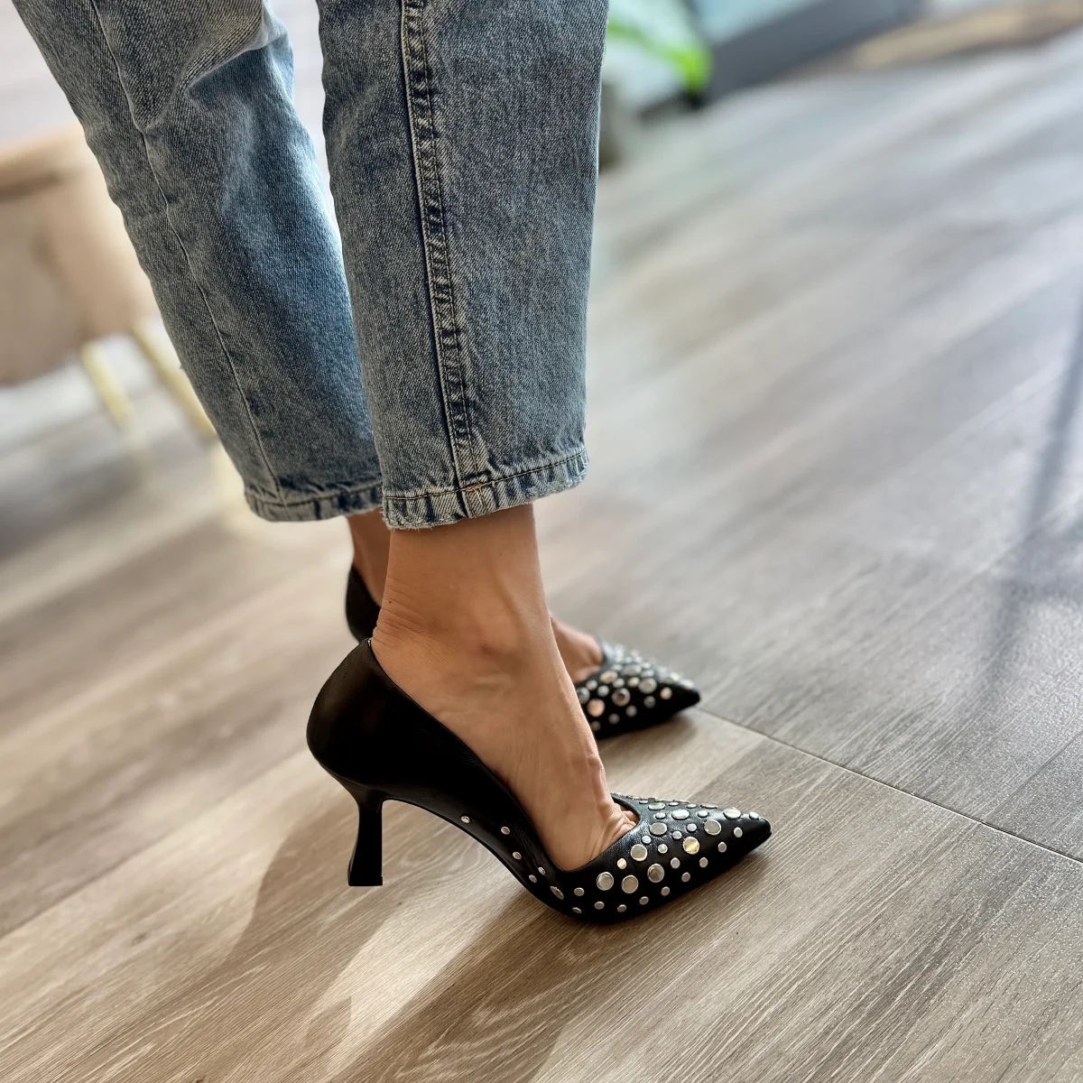 Décolleté donna tacco 7 cm nappa nera con borchie AI25 | pepperinacalzature.com