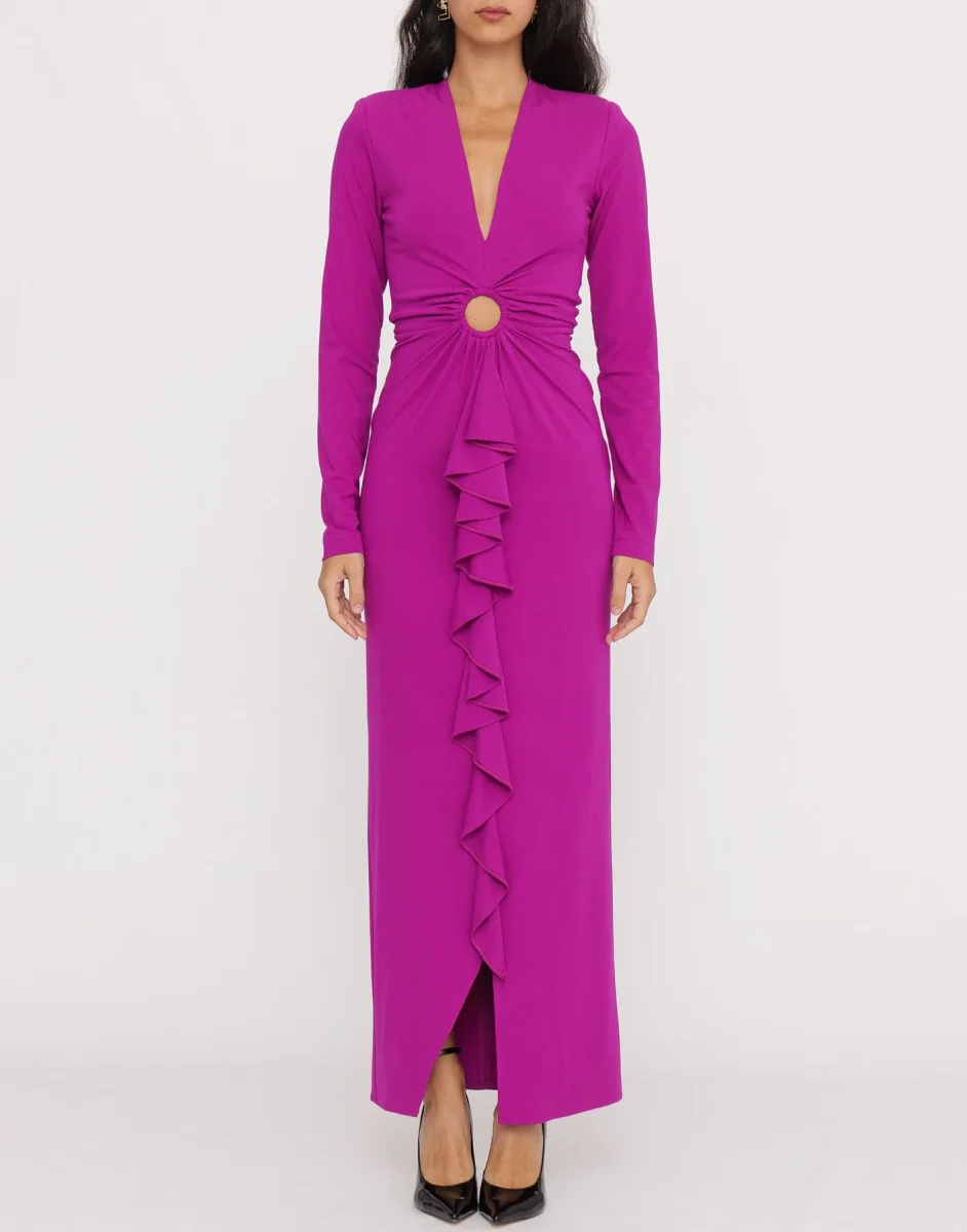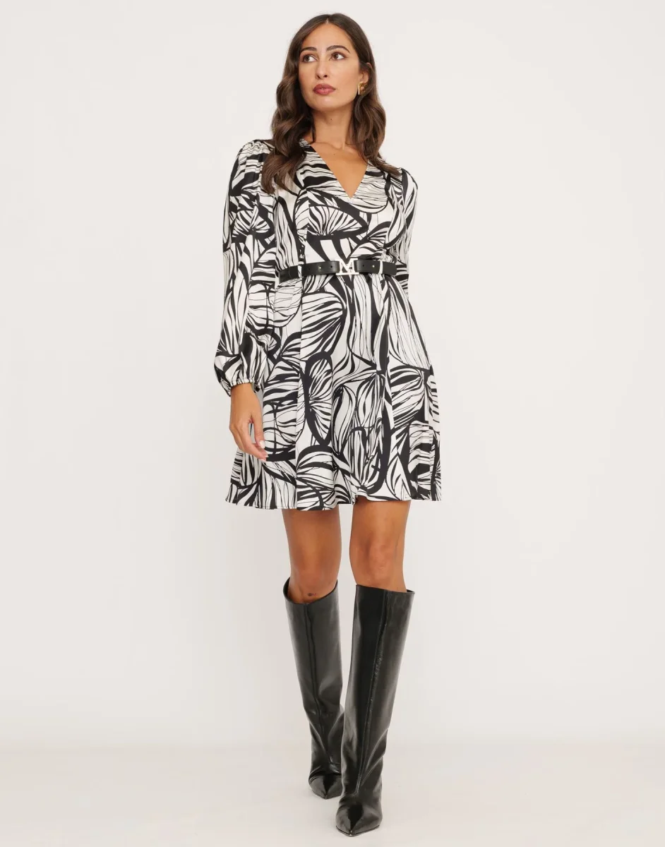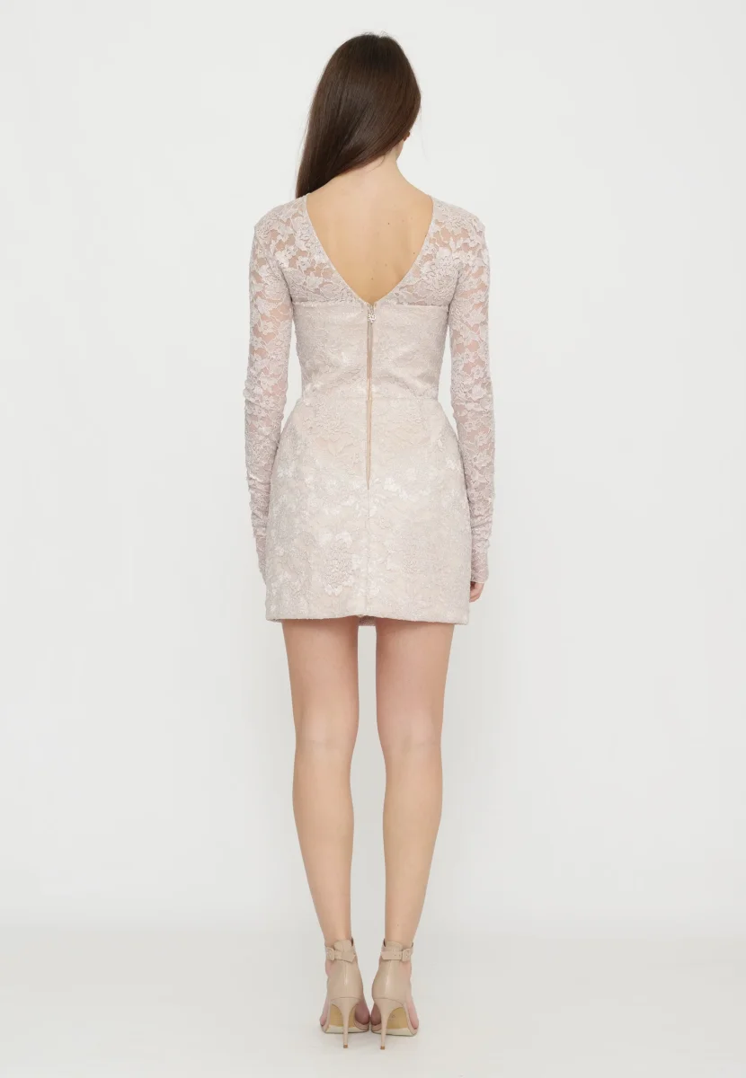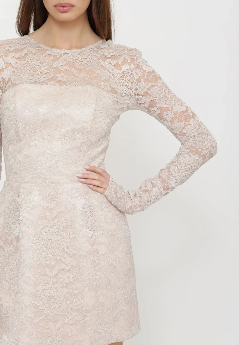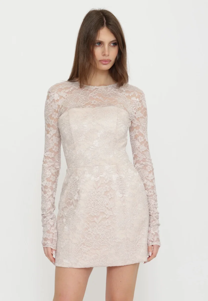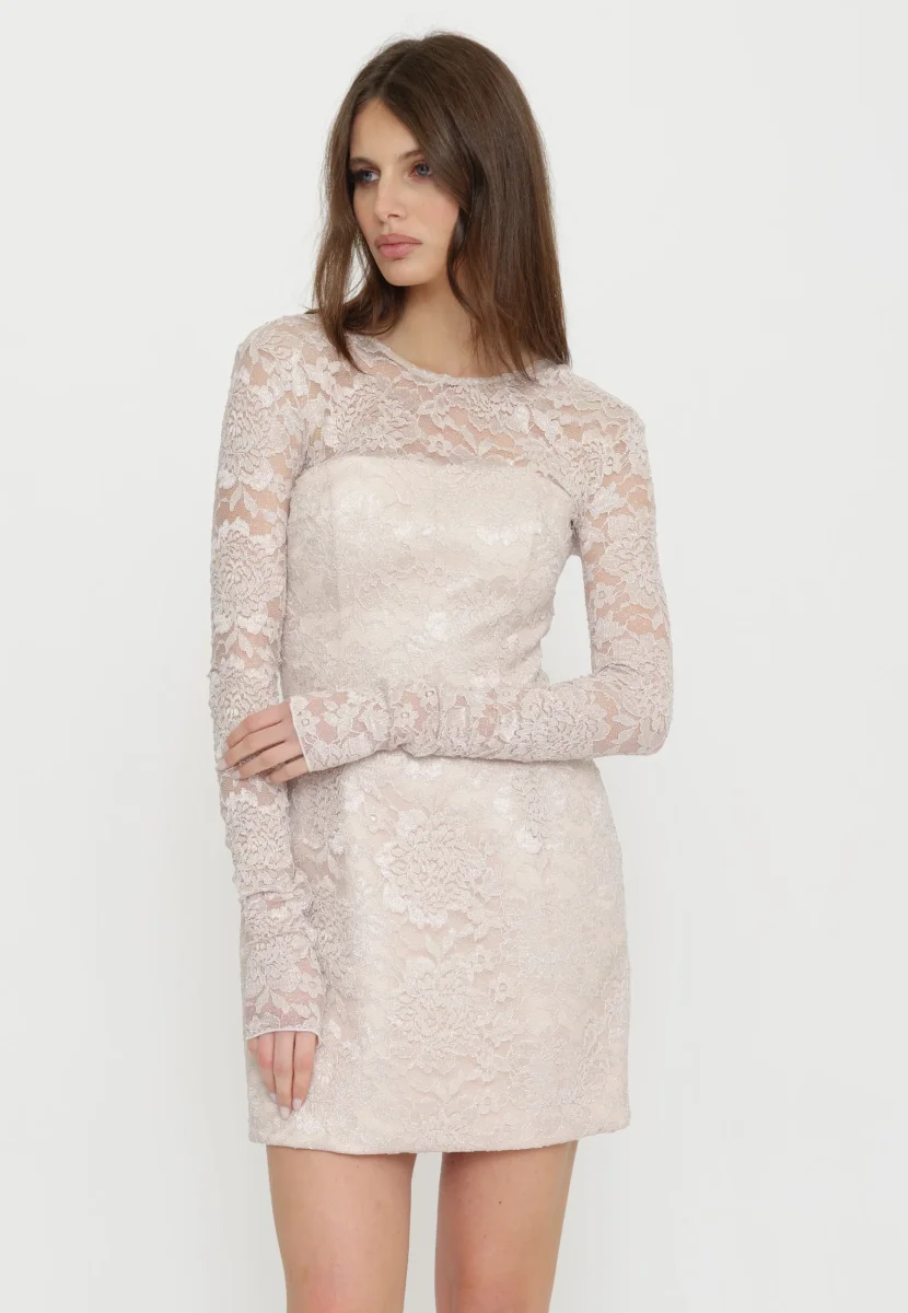 Elegante abito mini in pizzo lurex ricamato che cattura la luce con ogni movimento. Caratterizzato da maniche lunghe e uno scollatura a V profonda sul retro che crea un effetto sofisticato e sensuale. La gonna strutturata mantiene una silhouette impeccabile, mentre i dettagli in trasparenza aggiungono un tocco di raffinatezza. Completato da zip posteriore logata Aniyeby. Perfetto per occasioni speciali e serate cocktail.